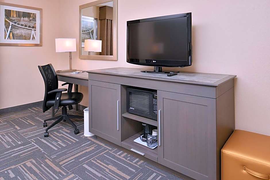 Any corresponding photo may not reflect the specific accessible room type or room feature. This mobility and hearing accessible, nonsmoking room features one king sized bed , and an accessible roll-in shower. The room also has a visual alarm and notification devices for the doorbell or door knock and incoming phone calls. The room features comfortable soft seating, microwave, refrigerator, a HDTV, and easy to operate alarm clock/radio. The free high speed internet access will help you stay connected while on the road. If you prefer not to work at the desk, you can use the convenient lapdesk instead. You'll also enjoy the convenience of having a coffee maker with tea service and iron/ironing board in your room.